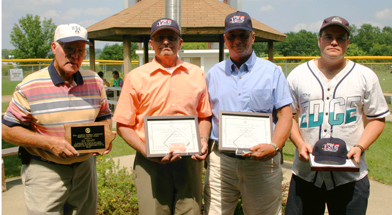 2006 Iowa ASA Men's 16" Slow Pitch Hall Of Fame Inductees L to R: Ed Sharp (Dedicated Service Award), Bob Strike Jr. (Umpire), Bill Armbrecht (Umpire), Greg Tiffany (Player) See Also: 2006 16" Hall of Fame Photo Gallery