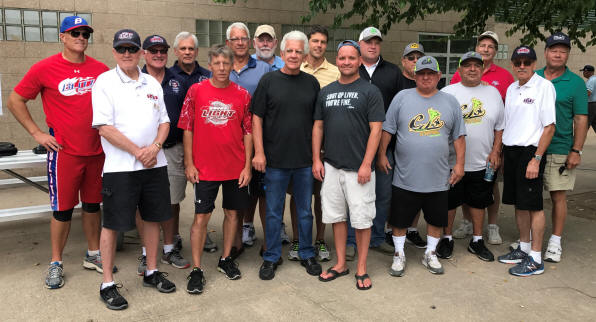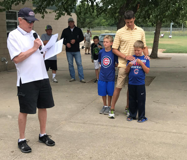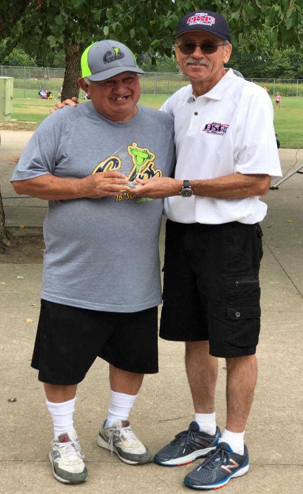 L to R Danny Arenas (Cedar Rapids), Tony Coppola (Decorah), Joey Coppola III (accepting is father Chuck Copolla Sr.), Todd Bluml (Carroll), Bob Fasbender (HOF Chairperson) |